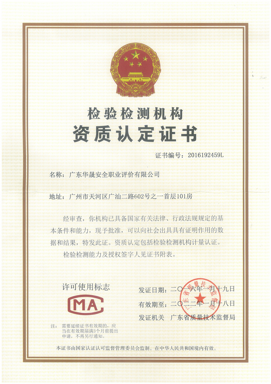 廣東華晟是《安全評(píng)價(jià)檢測(cè)檢驗(yàn)機(jī)構(gòu)管理辦法》(中華人民共和國應(yīng)急管理部令第1號(hào))頒布實(shí)施后廣東省首家經(jīng)廣東省應(yīng)急管理廳批準(zhǔn)的安全評(píng)價(jià)機(jī)構(gòu)。同時(shí),還取得了職業(yè)衛(wèi)生評(píng)價(jià)與檢測(cè)、檢驗(yàn)檢測(cè)計(jì)量認(rèn)證(CMA)、二(三)級(jí)安全生產(chǎn)標(biāo)準(zhǔn)化評(píng)審單位(冶金工貿(mào)、危險(xiǎn)化學(xué)品、礦山、煙花爆竹、城鎮(zhèn)燃?xì)獾刃袠I(yè))、安全生產(chǎn)標(biāo)準(zhǔn)化建設(shè)指導(dǎo)單位、雙重預(yù)防體系建設(shè)咨詢、工程咨詢、雷電防護(hù)裝置檢測(cè)、消防設(shè)施維護(hù)保養(yǎng)檢測(cè)與消防安全評(píng)估等資質(zhì)。廣東華晟已打造成同行業(yè)中為數(shù)不多能為客戶提供一站式、全過程、多領(lǐng)域?qū)I(yè)技術(shù)服務(wù)的機(jī)構(gòu)。