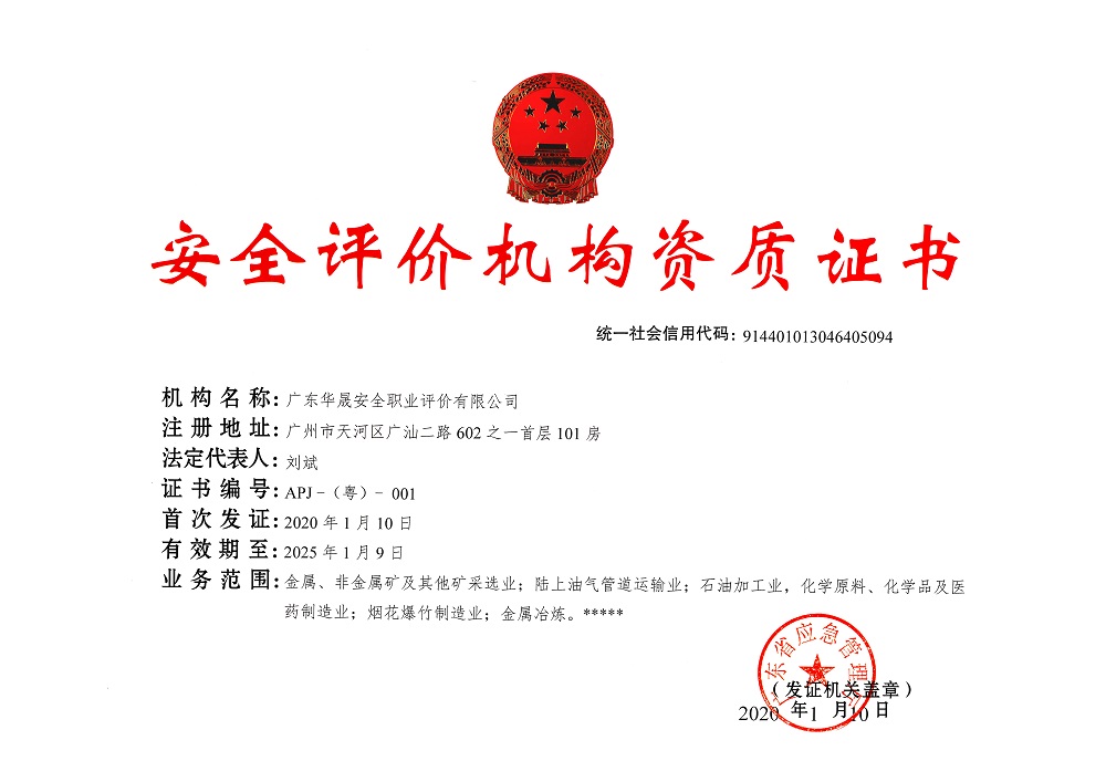 廣東華晟是《安全評價檢測檢驗機構管理辦法》(中華人民共和國應急管理部令第1號)頒布實施后廣東省首家經廣東省應急管理廳批準的安全評價機構。同時,還取得了職業衛生評價與檢測、檢驗檢測計量認證(CMA)、二(三)級安全生產標準化評審單位(冶金工貿、危險化學品、礦山、煙花爆竹、城鎮燃氣等行業)、安全生產標準化建設指導單位、雙重預防體系建設咨詢、工程咨詢、雷電防護裝置檢測、消防設施維護保養檢測與消防安全評估等資質。廣東華晟已打造成同行業中為數不多能為客戶提供一站式、全過程、多領域專業技術服務的機構。